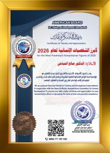 في لفتة تقديرية تعكس أهمية العمل الإنساني والإعلامي المشترك  قدم البورد الأمريكي للتدريب والتطوير الدولي، بالتعاون مع مؤسسة الأمن الوطني الإنسانية للتنمية البشرية، خطاب شكر وتقدير إلى الدكتور صالح المياحي رئيس الاتحاد العربي للإعلام الإلكتروني